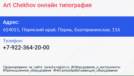 Art`Chekhov, онлайн-типография по адресу 614015, Пермский край, Пермь, Екатерининская, 116 в дальнейшем Организация, размещена в следующих категориях: