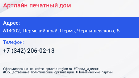 Артлайн, печатный дом по адресу 614002, Пермский край, Пермь, Чернышевского, 8 в дальнейшем Организация, размещена в следующих категориях: