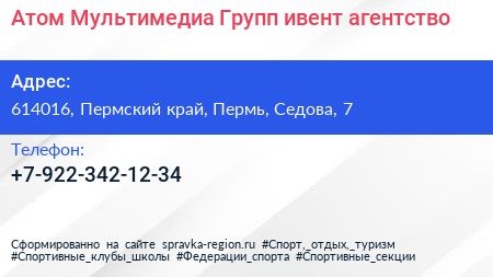 Атом Мультимедиа Групп, ивент-агентство по адресу 614016, Пермский край, Пермь, Седова, 7 в дальнейшем Организация, размещена в следующих категориях: