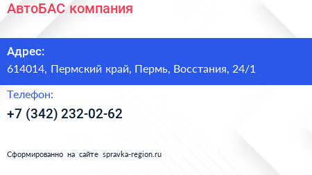АвтоБАС, компания по адресу 614014, Пермский край, Пермь, Восстания, 24/1 в дальнейшем Организация, размещена в следующих категориях: