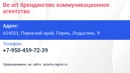 Be art, брендингово-коммуникационное агентство по адресу 614021, Пермский край, Пермь, Лодыгина, 9 в дальнейшем Организация, размещена в следующих категориях: