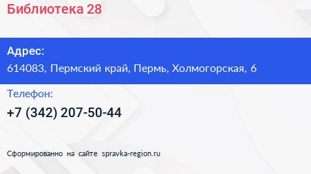 Библиотека №28 по адресу 614083, Пермский край, Пермь, Холмогорская, 6 в дальнейшем Организация, размещена в следующих категориях: