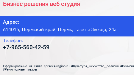 Бизнес решения, веб-студия по адресу 614015, Пермский край, Пермь, Газеты Звезда, 24а в дальнейшем Организация, размещена в следующих категориях: