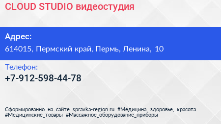 CLOUD STUDIO, видеостудия по адресу 614015, Пермский край, Пермь, Ленина, 10 в дальнейшем Организация, размещена в следующих категориях: