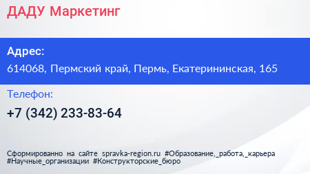 ДАДУ Маркетинг по адресу 614068, Пермский край, Пермь, Екатерининская, 165 в дальнейшем Организация, размещена в следующих категориях:
