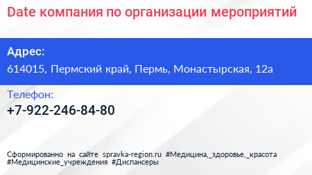 Date:, компания по организации мероприятий по адресу 614015, Пермский край, Пермь, Монастырская, 12а в дальнейшем Организация, размещена в следующих категориях: