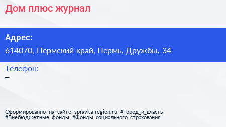 Дом плюс, журнал по адресу 614070, Пермский край, Пермь, Дружбы, 34 в дальнейшем Организация, размещена в следующих категориях: