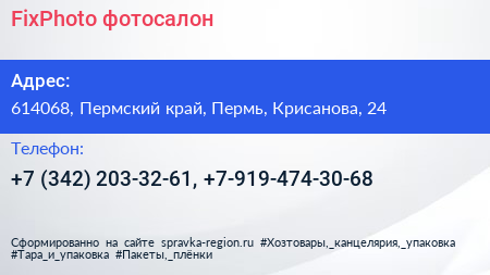 FixPhoto, фотосалон по адресу 614068, Пермский край, Пермь, Крисанова, 24 в дальнейшем Организация, размещена в следующих категориях: