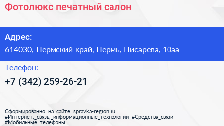 Фотолюкс, печатный салон по адресу 614030, Пермский край, Пермь, Писарева, 10аа в дальнейшем Организация, размещена в следующих категориях: