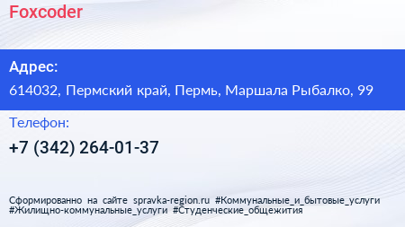 Foxcoder по адресу 614032, Пермский край, Пермь, Маршала Рыбалко, 99 в дальнейшем Организация, размещена в следующих категориях: