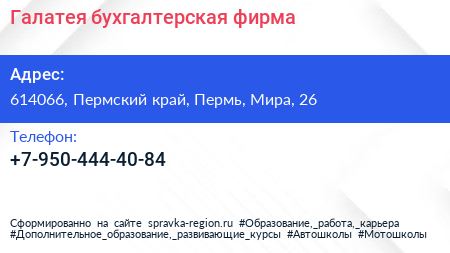 Галатея, бухгалтерская фирма по адресу 614066, Пермский край, Пермь, Мира, 26 в дальнейшем Организация, размещена в следующих категориях: