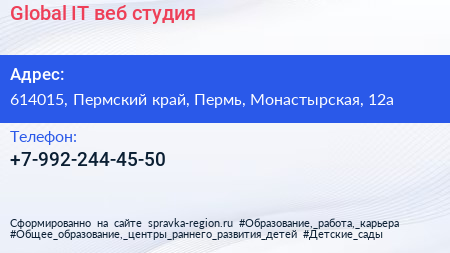 Global IT, веб-студия по адресу 614015, Пермский край, Пермь, Монастырская, 12а в дальнейшем Организация, размещена в следующих категориях: