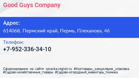 Good Guys Company по адресу 614068, Пермский край, Пермь, Плеханова, 46 в дальнейшем Организация, размещена в следующих категориях: