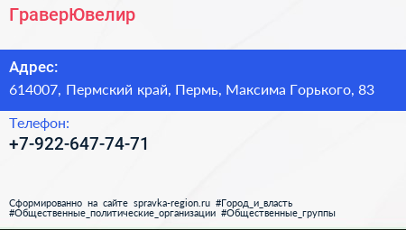 ГраверЮвелир по адресу 614007, Пермский край, Пермь, Максима Горького, 83 в дальнейшем Организация, размещена в следующих категориях: