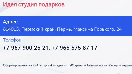Идея, студия подарков по адресу 614015, Пермский край, Пермь, Максима Горького, 24 в дальнейшем Организация, размещена в следующих категориях: