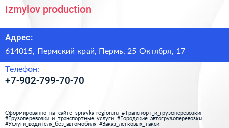 Izmylov production по адресу 614015, Пермский край, Пермь, 25 Октября, 17 в дальнейшем Организация, размещена в следующих категориях: