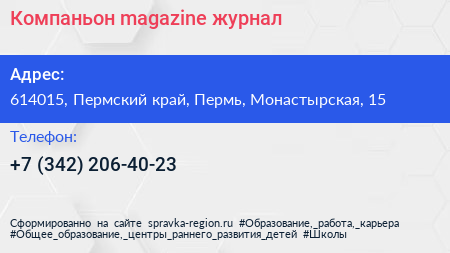 Компаньон-magazine, журнал по адресу 614015, Пермский край, Пермь, Монастырская, 15 в дальнейшем Организация, размещена в следующих категориях: