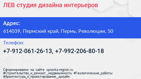 ЛЕВ, студия дизайна интерьеров по адресу 614039, Пермский край, Пермь, Революции, 50 в дальнейшем Организация, размещена в следующих категориях: