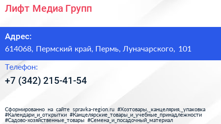 Лифт Медиа Групп по адресу 614068, Пермский край, Пермь, Луначарского, 101 в дальнейшем Организация, размещена в следующих категориях: