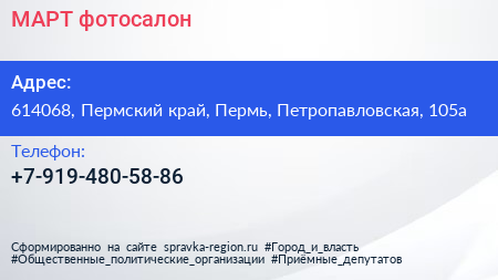 МАРТ, фотосалон по адресу 614068, Пермский край, Пермь, Петропавловская, 105а в дальнейшем Организация, размещена в следующих категориях: