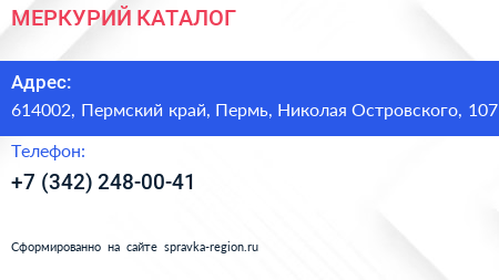 МЕРКУРИЙ-КАТАЛОГ по адресу 614002, Пермский край, Пермь, Николая Островского, 107 в дальнейшем Организация, размещена в следующих категориях: