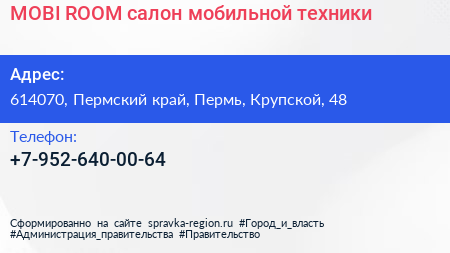 MOBI ROOM, салон мобильной техники по адресу 614070, Пермский край, Пермь, Крупской, 48 в дальнейшем Организация, размещена в следующих категориях: