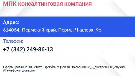 МПК, консалтинговая компания по адресу 614064, Пермский край, Пермь, Чкалова, 9е в дальнейшем Организация, размещена в следующих категориях: