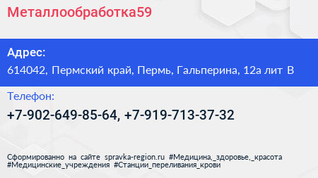 Металлообработка59 по адресу 614042, Пермский край, Пермь, Гальперина, 12а лит В в дальнейшем Организация, размещена в следующих категориях: