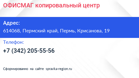 ОФИСМАГ, копировальный центр по адресу 614068, Пермский край, Пермь, Крисанова, 19 в дальнейшем Организация, размещена в следующих категориях: