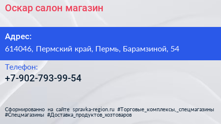 Оскар, салон-магазин по адресу 614046, Пермский край, Пермь, Барамзиной, 54 в дальнейшем Организация, размещена в следующих категориях: