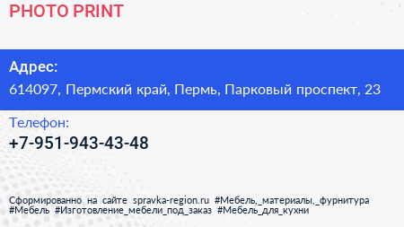 PHOTO-PRINT по адресу 614097, Пермский край, Пермь, Парковый проспект, 23 в дальнейшем Организация, размещена в следующих категориях: