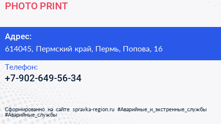PHOTO-PRINT по адресу 614045, Пермский край, Пермь, Попова, 16 в дальнейшем Организация, размещена в следующих категориях: