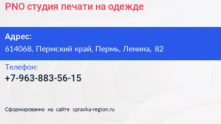 PNO!, студия печати на одежде по адресу 614068, Пермский край, Пермь, Ленина, 82 в дальнейшем Организация, размещена в следующих категориях: