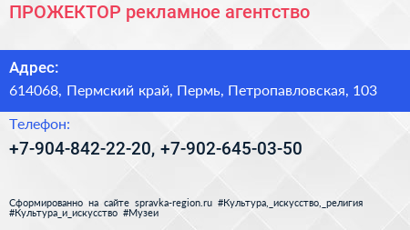 ПРОЖЕКТОР, рекламное агентство по адресу 614068, Пермский край, Пермь, Петропавловская, 103 в дальнейшем Организация, размещена в следующих категориях: