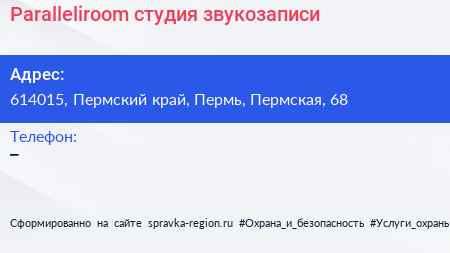 Paralleliroom, студия звукозаписи по адресу 614015, Пермский край, Пермь, Пермская, 68 в дальнейшем Организация, размещена в следующих категориях: