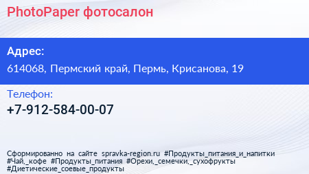 PhotoPaper, фотосалон по адресу 614068, Пермский край, Пермь, Крисанова, 19 в дальнейшем Организация, размещена в следующих категориях: