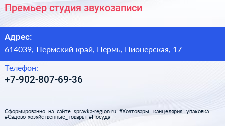 Премьер, студия звукозаписи по адресу 614039, Пермский край, Пермь, Пионерская, 17 в дальнейшем Организация, размещена в следующих категориях: