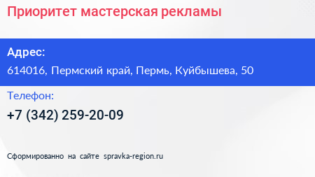 Приоритет, мастерская рекламы по адресу 614016, Пермский край, Пермь, Куйбышева, 50 в дальнейшем Организация, размещена в следующих категориях: