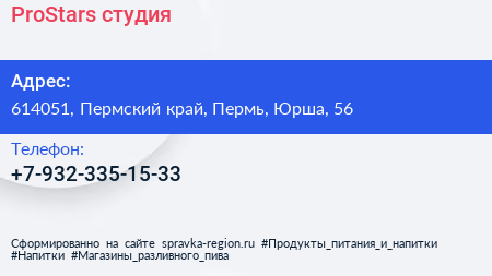 ProStars, студия по адресу 614051, Пермский край, Пермь, Юрша, 56 в дальнейшем Организация, размещена в следующих категориях: