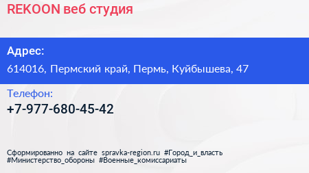 REKOON, веб-студия по адресу 614016, Пермский край, Пермь, Куйбышева, 47 в дальнейшем Организация, размещена в следующих категориях: