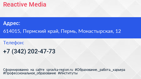 Reactive Media по адресу 614015, Пермский край, Пермь, Монастырская, 12 в дальнейшем Организация, размещена в следующих категориях: