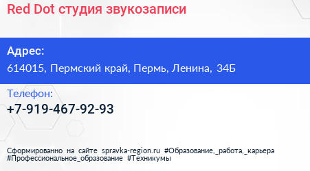 Red Dot, студия звукозаписи по адресу 614015, Пермский край, Пермь, Ленина, 34Б в дальнейшем Организация, размещена в следующих категориях: