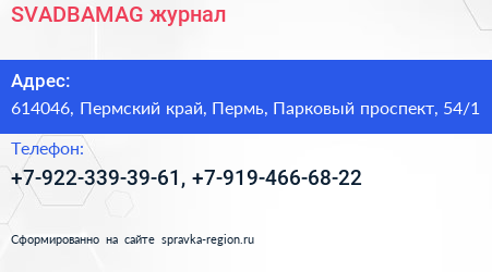 SVADBAMAG, журнал по адресу 614046, Пермский край, Пермь, Парковый проспект, 54/1 в дальнейшем Организация, размещена в следующих категориях: