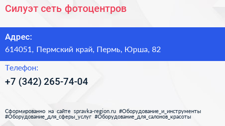 Силуэт, сеть фотоцентров по адресу 614051, Пермский край, Пермь, Юрша, 82 в дальнейшем Организация, размещена в следующих категориях: