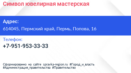 Символ, ювелирная мастерская по адресу 614045, Пермский край, Пермь, Попова, 16 в дальнейшем Организация, размещена в следующих категориях: