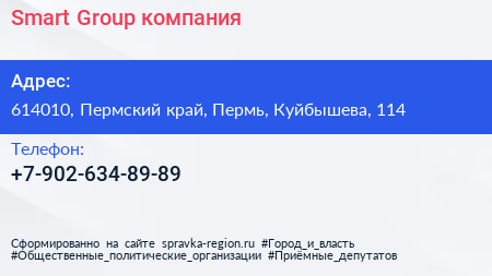 Smart Group, компания по адресу 614010, Пермский край, Пермь, Куйбышева, 114 в дальнейшем Организация, размещена в следующих категориях: