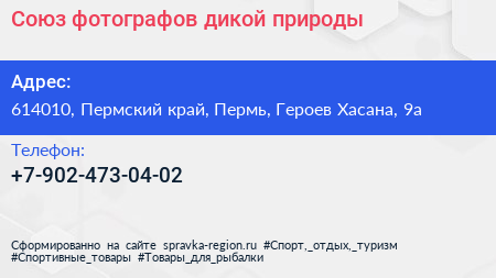 Союз фотографов дикой природы по адресу 614010, Пермский край, Пермь, Героев Хасана, 9а в дальнейшем Организация, размещена в следующих категориях: