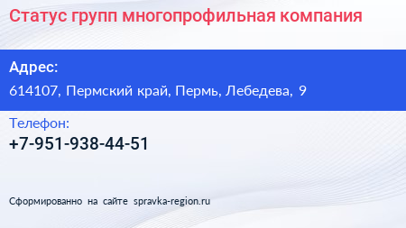 Статус групп, многопрофильная компания по адресу 614107, Пермский край, Пермь, Лебедева, 9 в дальнейшем Организация, размещена в следующих категориях: