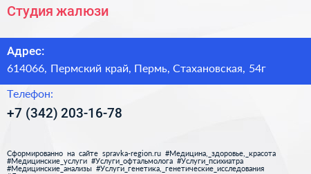 Студия жалюзи по адресу 614066, Пермский край, Пермь, Стахановская, 54г в дальнейшем Организация, размещена в следующих категориях: