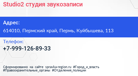 Studio2, студия звукозаписи по адресу 614010, Пермский край, Пермь, Куйбышева, 113 в дальнейшем Организация, размещена в следующих категориях: